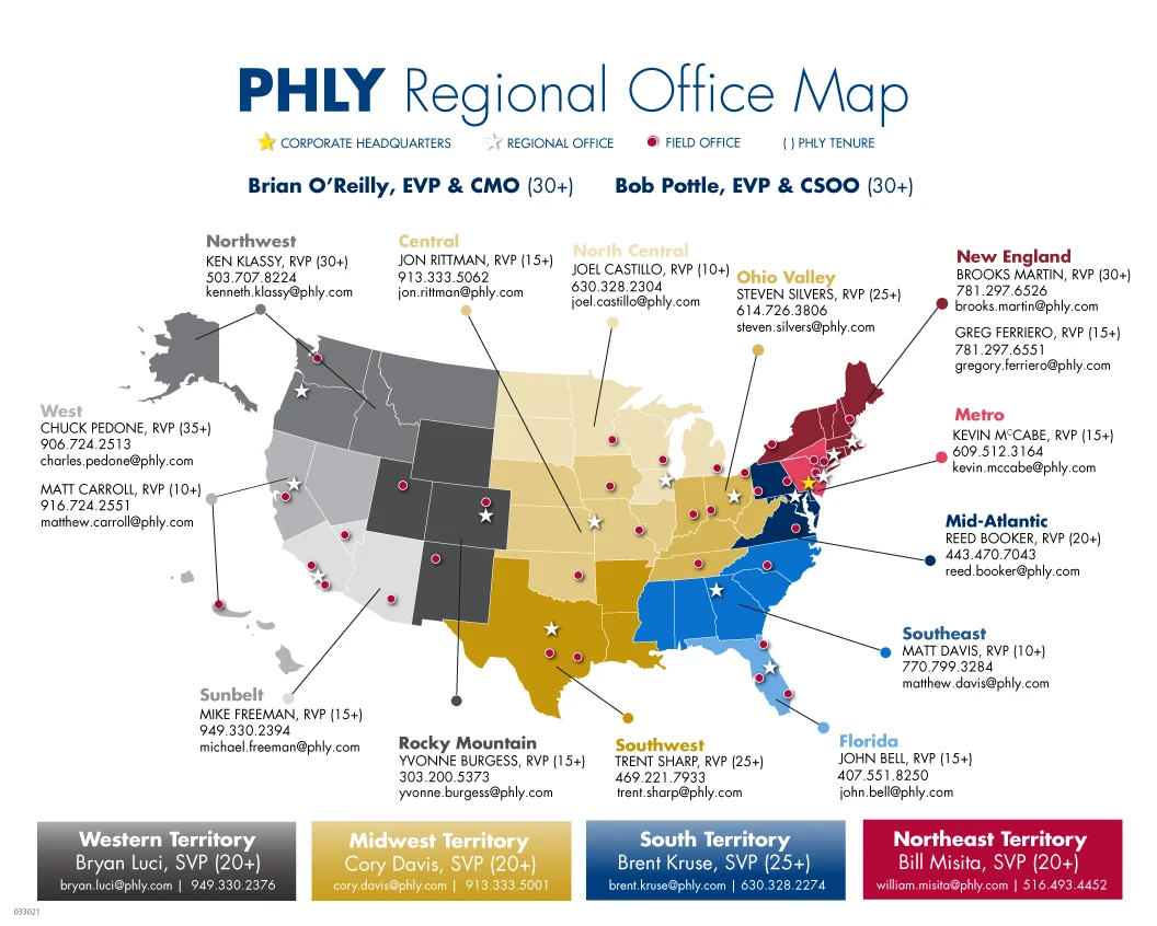 PHLY has re-aligned to better serve the needs of our agents and customers. The former Eastern Territory is now split into the Northeast and South Territories (see map below). Bill Misita has been promoted to SVP for the Northeast Territory, while Brent Kruse has been promoted to SVP for the South Territory. Misita and Kruse previously led regions as Regional Vice President and have both been with the Company for over 20 years. They know what makes PHLY special.